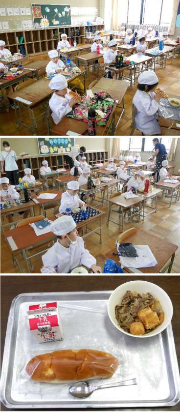 1年生にとって初めての給食でした。パンと牛乳と、副食はすき焼き煮です。とてもおいしくいただくことができました。