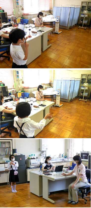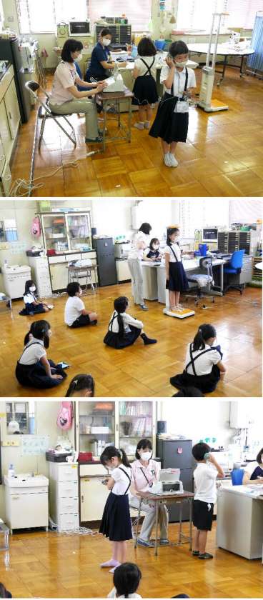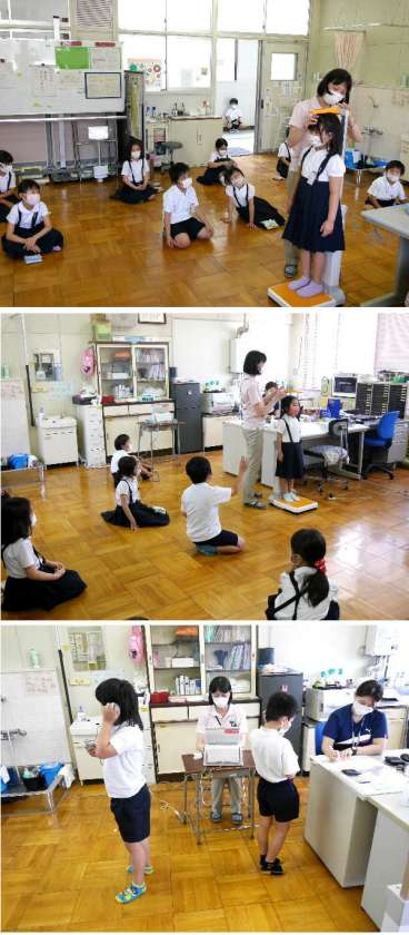 2年生では、保健室で発育測定と著力検査、視力検査を行いました。保健室に入るのは10人までとして、間隔をとって並びます。