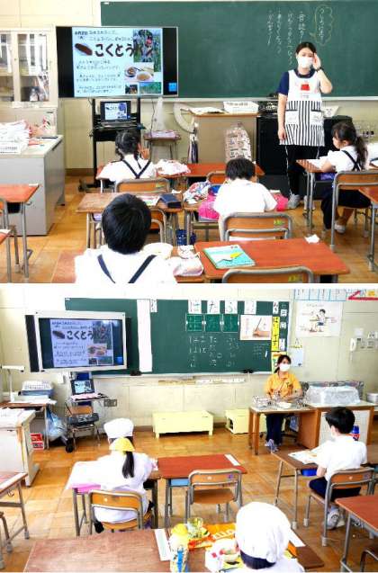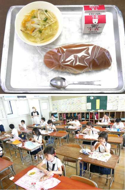 今日の給食は、黒糖パン、牛乳、中華スープでした。教室の大型モニターには、給食の情報が掲示されています。