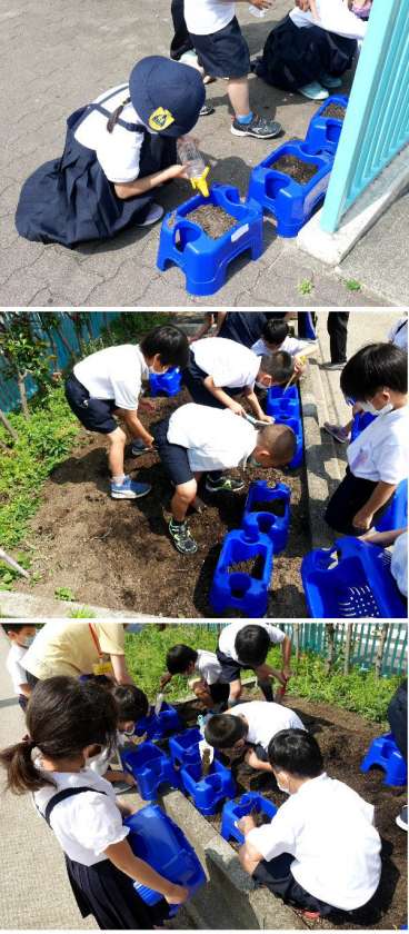 1年生は、2年生からもらったあさがおの種を植えました。種を5つもらって、指で穴を5つあけてうえました。そして、たっぷりの水をあげました。芽がでるのが楽しみですね。