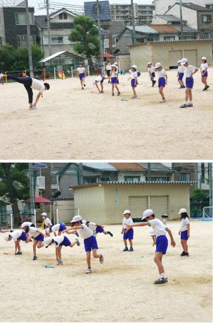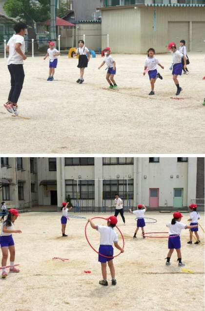 3年生は運動場で体育の授業をしています。ホームステイで身体が動かせていない人も多かったのではないでしょうか。簡単な体操から始めます。なわとびと、フラフープで楽しんで運動しました。