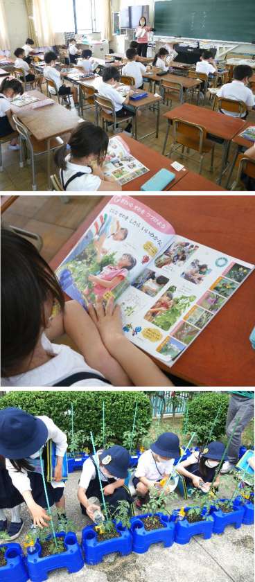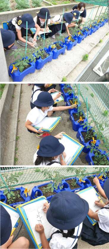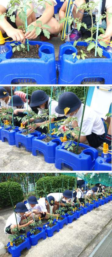 2年生が植えたミニトマトはどんどん大きくなってきました。もう、黄色い花が咲いているのもあります。おいしいミニトマトができるように、わき芽をとりました。しっかり絵をかいて観察もしました。