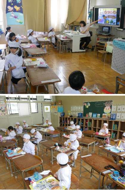 今日の給食は、スープ、パンプキンパン、牛乳でした。教室のプロジェクタには、今日の給食メニューについての説明があり、先生が説明しています。