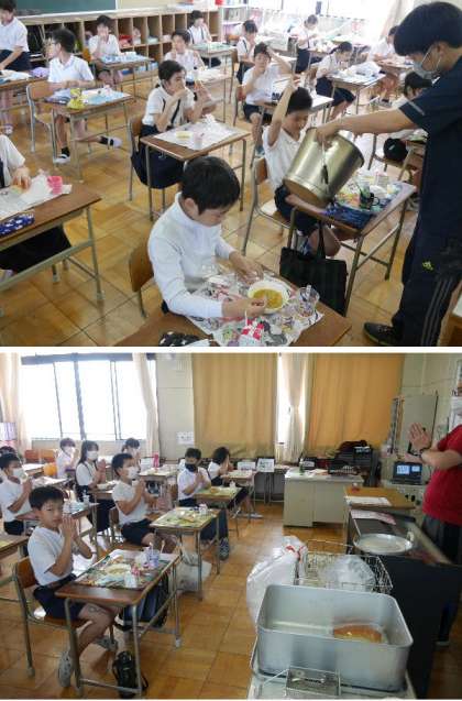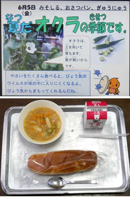 今日の給食は、みそしる、おさつパン、牛乳でした。みそしるには、いろいろな野菜がはいっていて、とてもおいしかったですね。