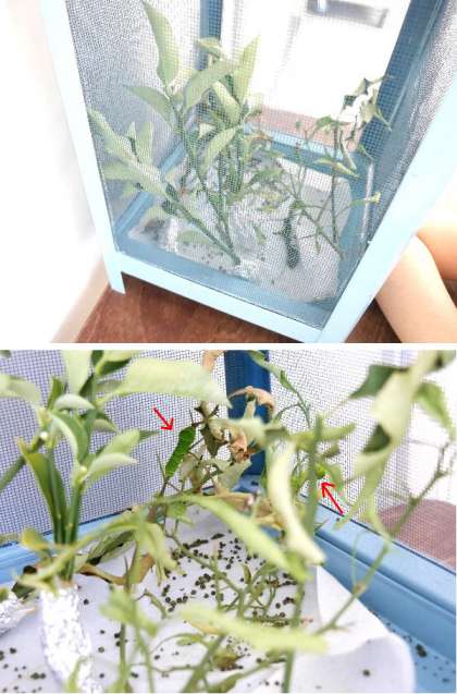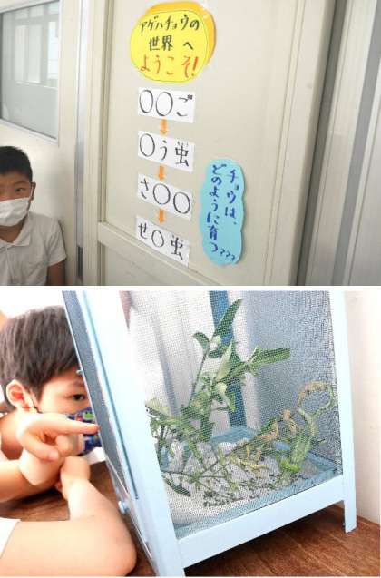 3年生の教室の前のかごには、アゲハチョウの幼虫が育てられ、子どもたちは、その成長ら興味津々です。
