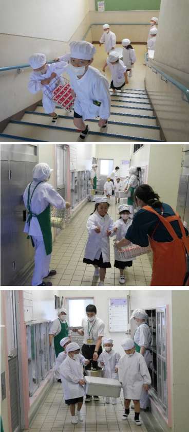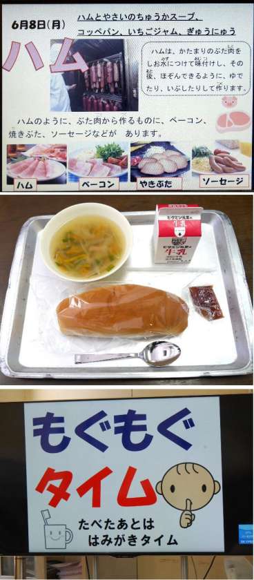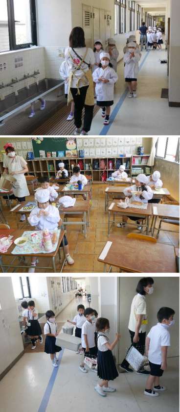 今日の献立は、中華スープ、コッペパン、いちごジャム、牛乳でした。おいしくいただきました。今日から午後の部の児童が、午前と入れ替わったので、給食当番もかわりました。1年生もだいぶ慣れてきました。