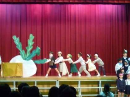 1年生は、指文字を使って「あいうえおの歌」を歌いました。「あ」から「ん」まで、全員が指文字を覚えて表現することができました。歌の後にはグループごとに、短いことばを覚えた指文字で発表しました。また、国語で勉強した「おおきなかぶ」の劇を、手話を取り入れて、上手に行いました。