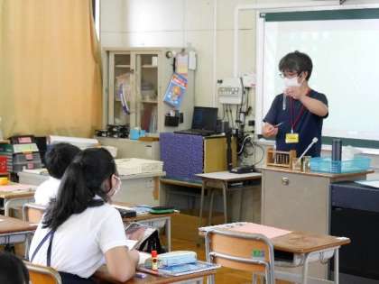 6年生の理科です。食べ物は、口の中でどのように変化するのか、だ液によるでんぷんの変化の実験観察をしています。先生が前でしたのをみて観察します。