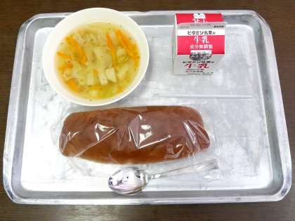 今日の献立は、スープ、こくとうパン、牛乳でした。