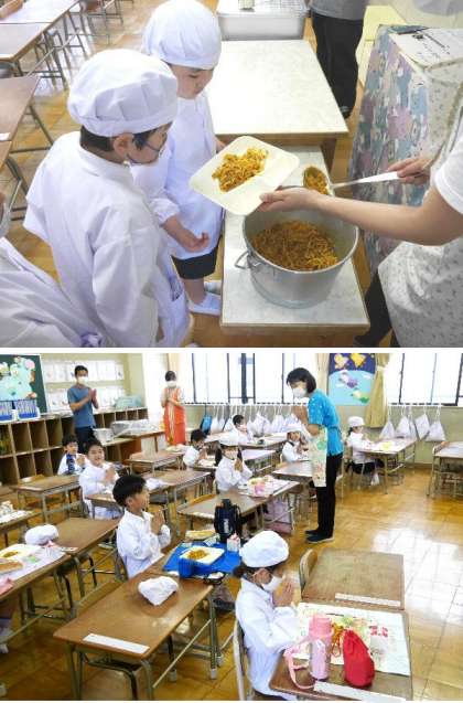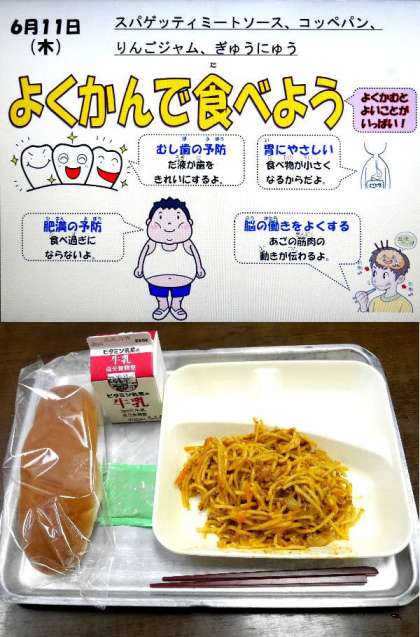 今日の献立は、スパゲティミートソース、コッペパン、りんごジャム、牛乳でした。はじめてプレート皿が登場しましたね。もとの給食に近づいているかんじです。