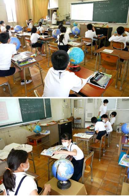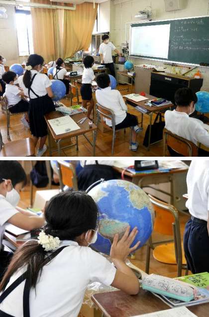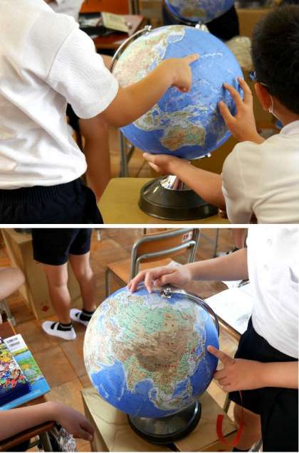 5年生の社会の授業です。世界の中の日本について学習しています。今日は地球儀をみながらの学習です。先生から「なぜ、日本は極東とよばれているのか」と質問です。地球儀を見ながら理由を考えているところです。