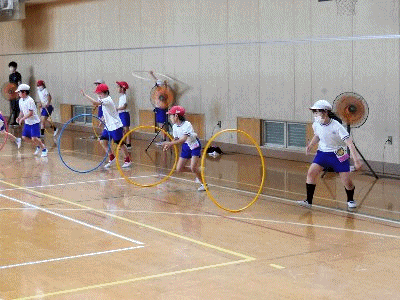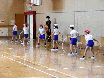 4年生の体育の授業が体育館て行われています。フラフープをころがして、上手にくぐっています。むずかしそうです。