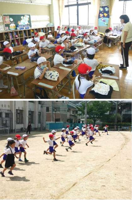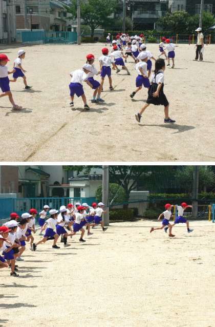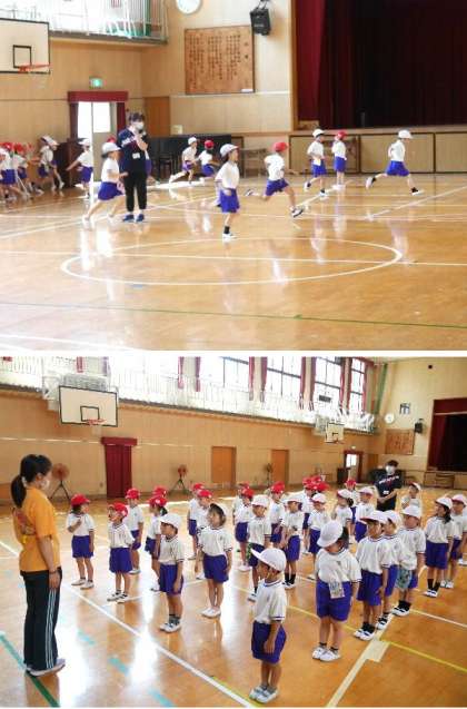 1年生の体育の授業が、運動場と体育館で行われています。体操服に着替えてはつらつと走ったり、並んだり、基本をしっかり身につけます。