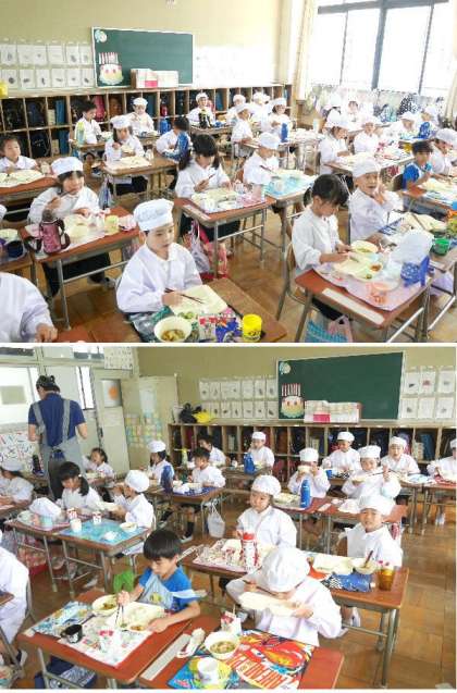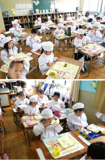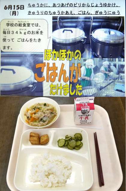 今日の献立は、中華煮、厚揚げのピリ辛じょうゆがけ、きゅうりの中華あえ、ごはん、牛乳です。今年度はじめてのごはんの給食です。おいしくいただきました。