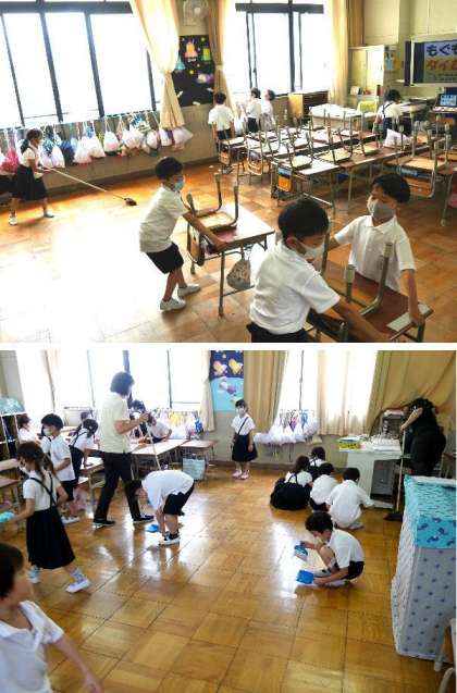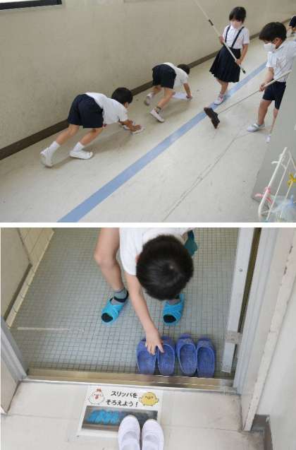 給食を食べたあと、昼休みのあとに清掃活動です。1年生は元気いっぱい、皆で協力してきれいにします。トイレの掃除では、ちゃんとスリッパをそろえてくれています。