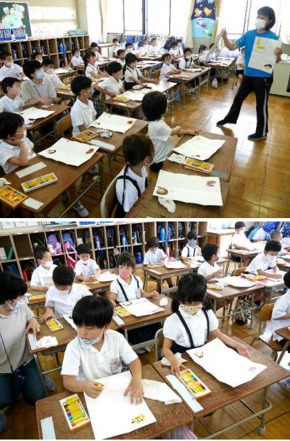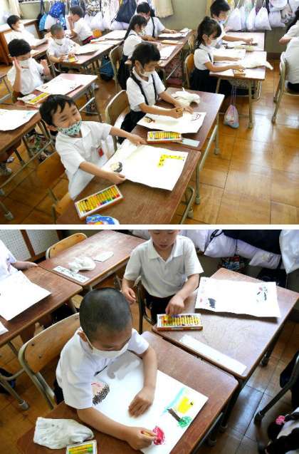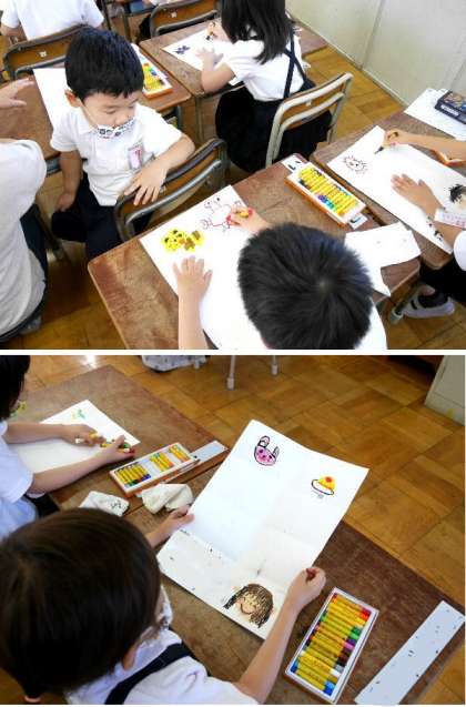 1年生が画用紙にクレヨンで、自分の好きなものの絵をかいています。好きな食べ物もいろいろです。