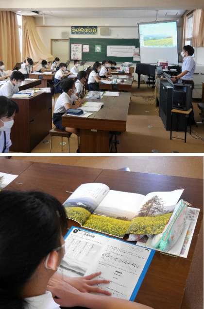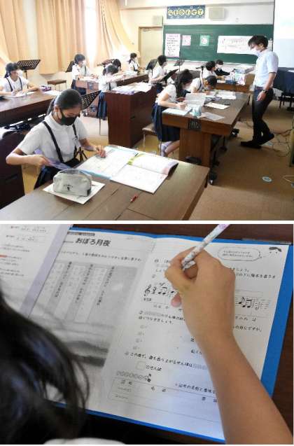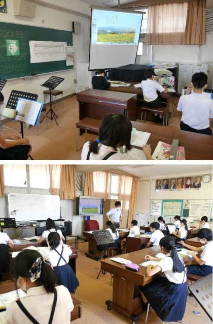 6年生の音楽の授業です。まだ、合唱ができないですが、音楽を鑑賞したり、音階をかいたりしています。
