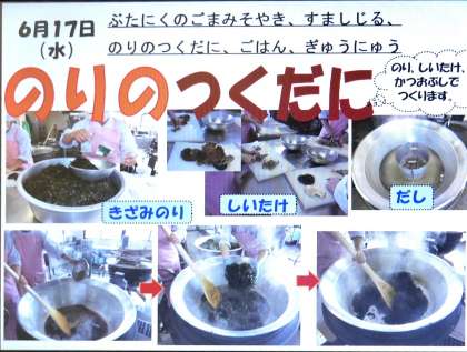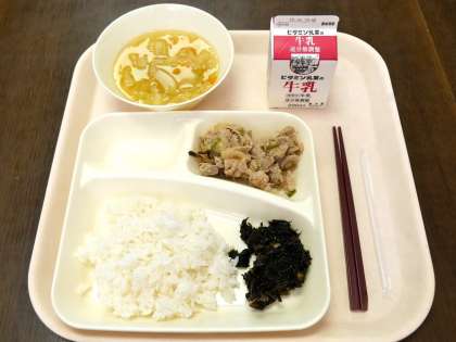 今日の献立は、豚肉のごまみそやき、すまし汁、のりのつくだに、ごはん、牛乳でした。今日のごはんもすすみますね。のりつくだにがあいます。