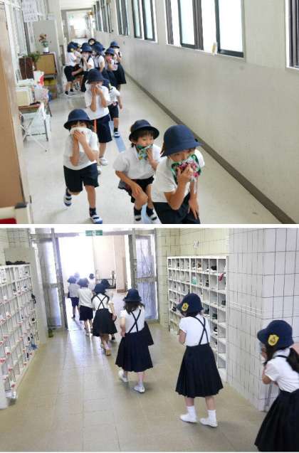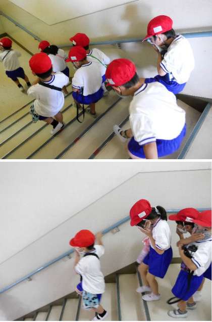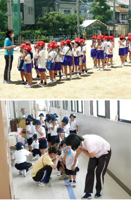 1年生の避難訓練です。給食室から火災発生の想定です。ハンカチを口にあてて、背をひくくして運動場まで避難しました。