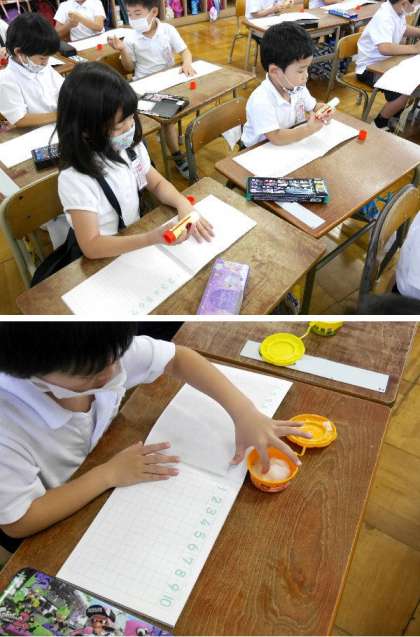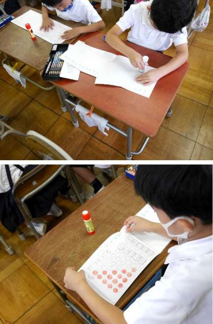 1年生が学習したプリントをノートにのりではりつけています。先生から、きれいに、じょうずにはるコツを教えてもらいました。