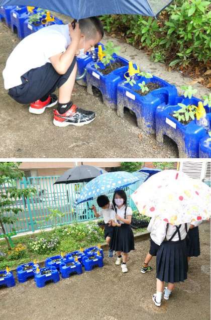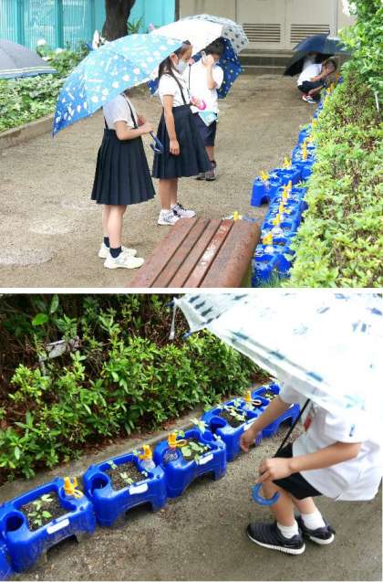 雨降りの日は水やりは必要ありませんが、アサガオの成長が気になってしかたありません。傘をさして様子を見に来ています。大きくなったかな。
