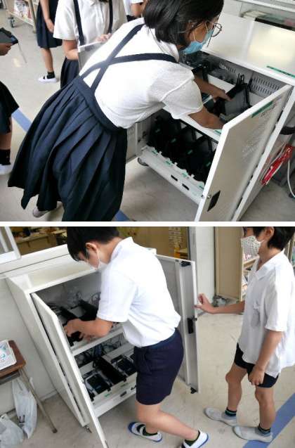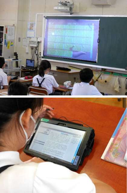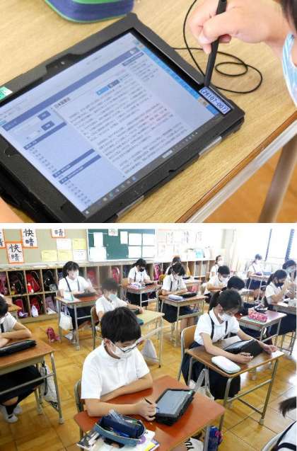 6年生は教室の前からタブレットを取り出して、先生のタブレットに接続して、日本国憲法の前文を送ってもらって読みました。