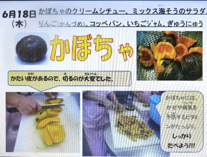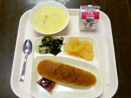 紀要の献立は、かぼちゃのクリームシチュー、ミックス海藻のサラダ、りんご(缶)、コッペパン、いちごジャム、牛乳でした。