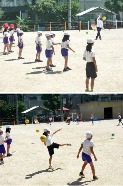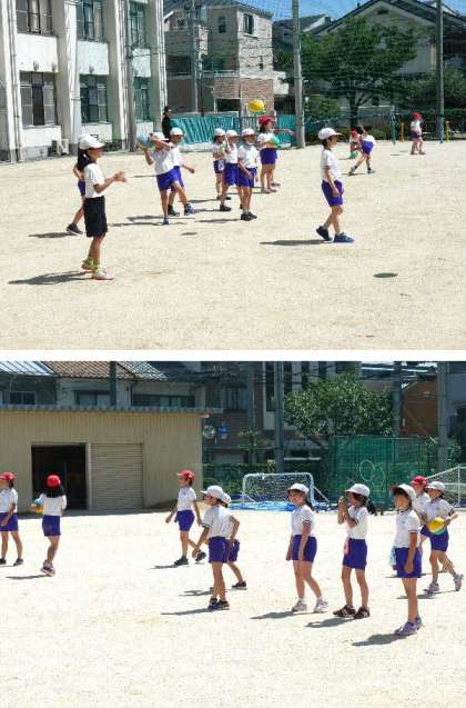 3年生の体育です。とても日差しが強いですが、元気いっぱいボール投げをしていました。