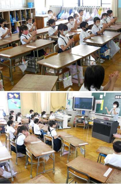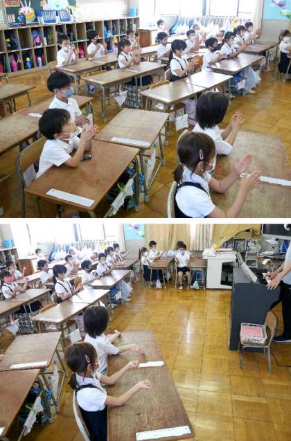 1年生の音楽では、音楽にあわせて、手拍子でリズムをとっています。なかなかみんなの手拍子がそろいません。とめるところでも、音がでてしまいます。むずかしいですね。