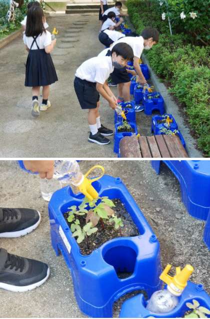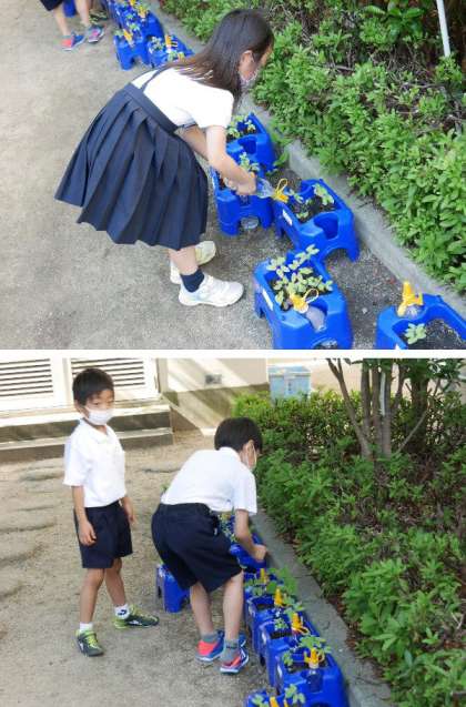 1年生は登校すると、すぐにアサガオを見にきます。毎日大きくなっていくのが気になって、水やりをしています。だいぶ大きくなりましたね。