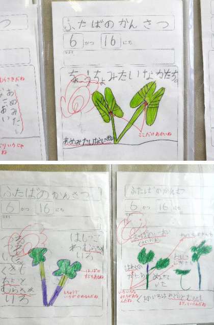 1年生がアサガオの観察で書いた絵です。気づいたことも書いています。しっかりよく見ていますね。