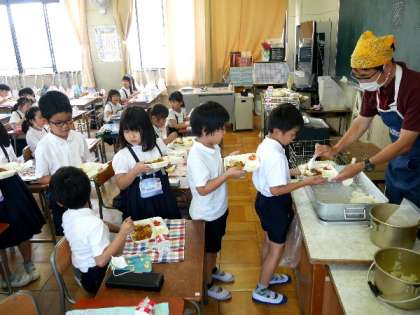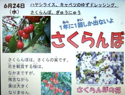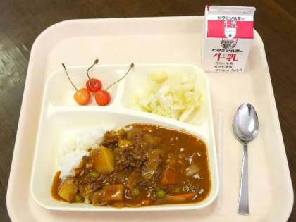 今日の献立は、ハヤシライス、キャベツのゆずドレッシング、さくらんぼ、牛乳でした。ハヤシライスのおかわりに列ができています。