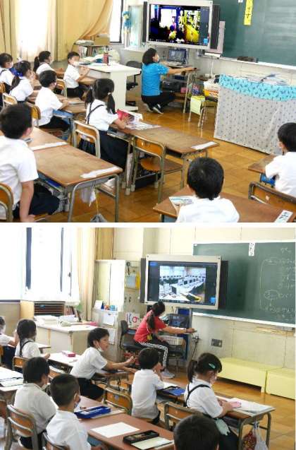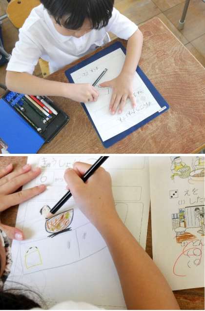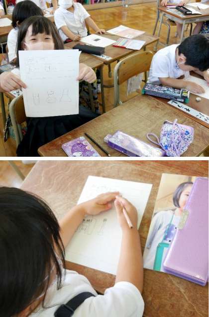 1年生の学校探検で、いろいろな教室を見てまわりました。一番印象に残ったところを絵に描いています。どこが気になりましたか。やっぱり、理科室のガイコツかな。