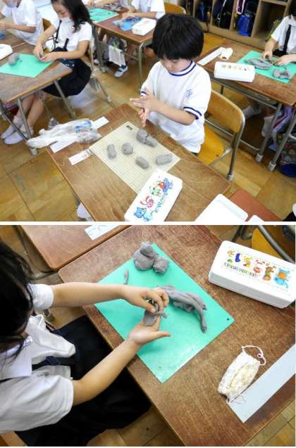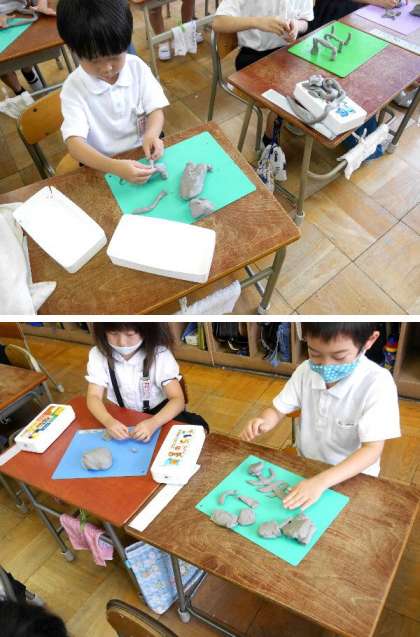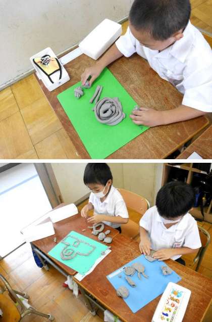 1年生がねんどでいろいろなものを作っています。葉っぱにのるかたつむりや、動物、虫だったり、おそばを作っている人もいます。細かい作業に集中して、手先の細やかさも育っていきます。