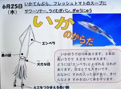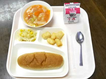 今日の献立は、いかてんぷら、フレッシュトマトのスープ煮、サワーソテー、ライ麦パン、牛乳です。いかの天ぷらが人気でした。おいしいね。