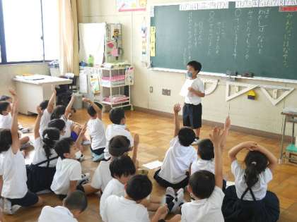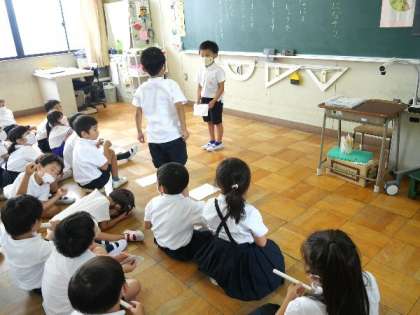 1年生が、みんなに話す学習をしています。お題は「わたしは何をみつけたでしょうか」です。みつけたものをみんなの前で話します。〜でみつけました。と文にして話す練習をしているんです。少しずつ、会話でなく、文章を作れるようになっていきます。