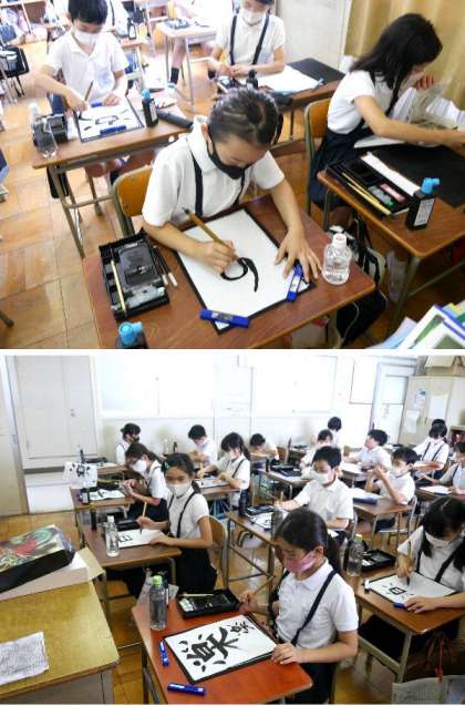5年生で、学級目標を決めています。楽しいクラス、楽しむクラス。その「楽」の漢字を書道でデザインしてみました。