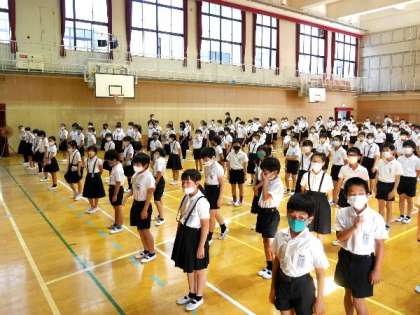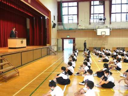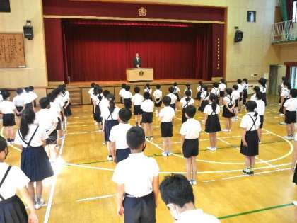 今日は、4年〜6年生の全校朝会を講堂でおこないました。