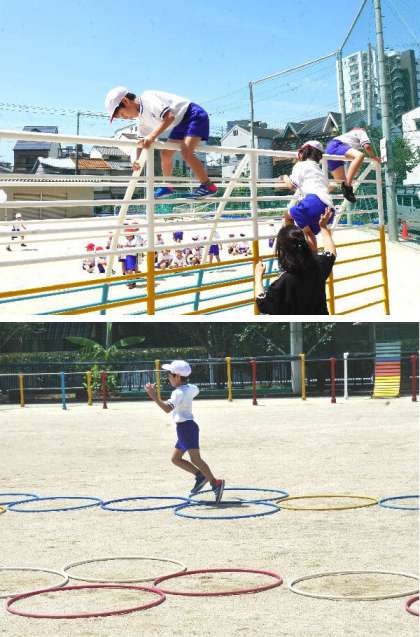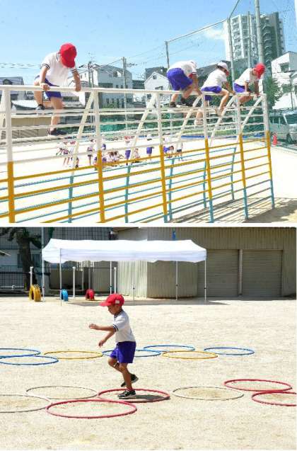 1年生の体育の授業です。校庭の遊具を登って、よゆうのある人はまたいで降りてきます。高いから気をつけてがんばりましょう。そして、ケンケンケパーと輪をとんでいます。元気いっぱいです。