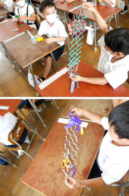 来週の7月7日は七夕です。たなばたの飾りを作っています。折り紙を折ってハサミで切れ目をていねいに入れていきます。広げると天の川の飾りができあがりです。