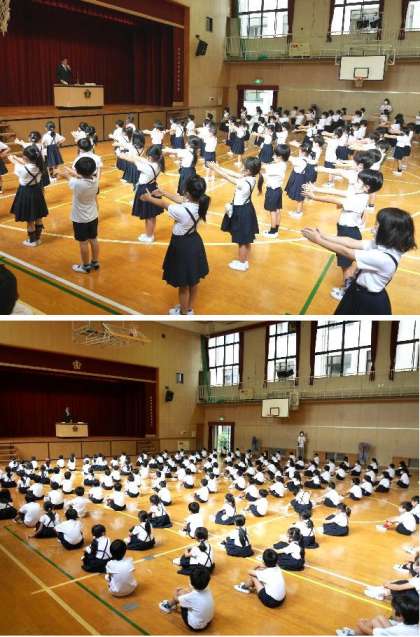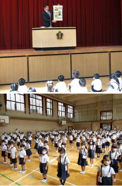 校長先生から、「いじめ」について考えるお話をしました。3匹のカエルのお話は、ふだんの学校生活のなかで、自分のことを「ふりかえる」、「きりかえる」、そしてしっかり「かんがえる」ことが大切ですとお話しました。