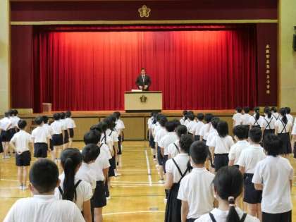 隔週で、高学年と低学年に分けて、全校朝会を行います。