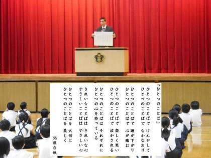 校長先生から、北原白秋の「ひとつのことば」という詩を紹介しました。みんなが発している言葉を大切にしてほしいです。一言で相手を傷つけることもあるし、一言で励ますこともできるのです。