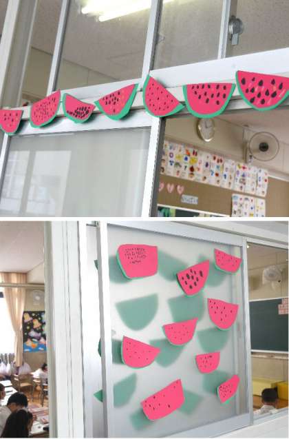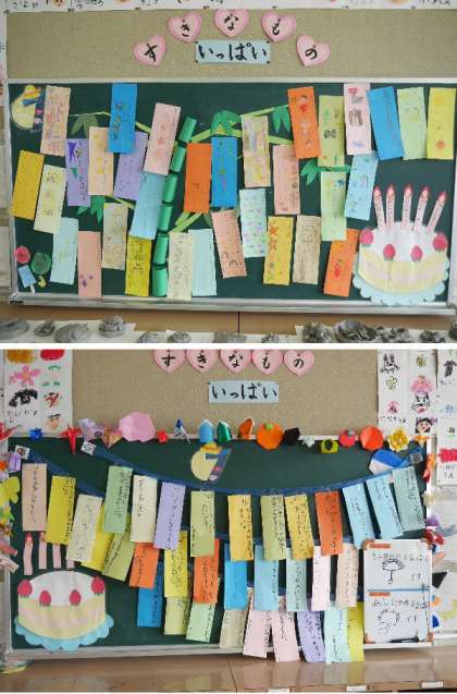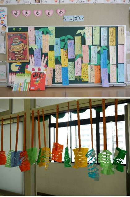 今日は七夕ですね。あいにくの雨天で星が見えないのが残念です。1年生のそれぞれの教室のうしろに、みんなで書いた願い事がはられています。「家族が病気になりませんように」「サッカーがうまくなれるように」「あたまが7よくなりますように」と、いろいろな願いがありますね。