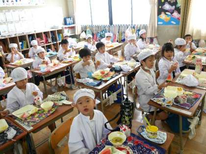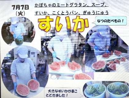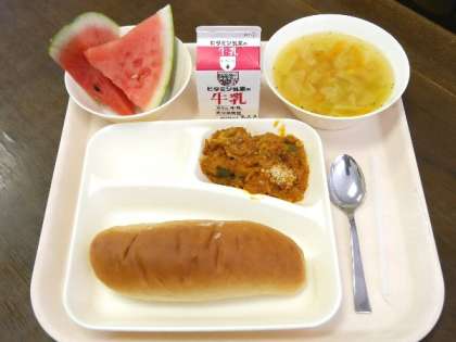 今日の献立は、かぼちゃのミートグラタン、スープ、黒糖パン、牛乳、スイカでした。今年はじめて食べる人もいていました。
