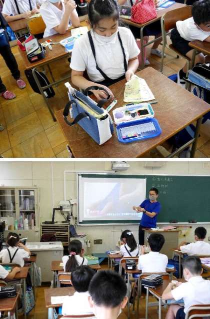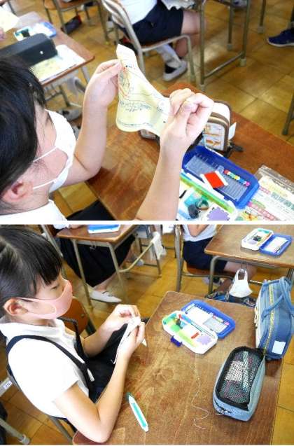5年生の家庭科では、針に糸を通して、練習用の布に玉どめの練習をしています。何度も先生が説明しているのですが、なかなか難しくてできません。悪戦苦闘で裁縫をがんばっている5年生でした。