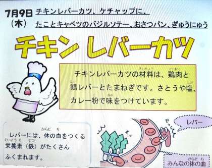 今日の献立は、チキンレバーカツ、ケチャップ煮、たことキャベツのバジルソテー、おさつパン、牛乳でした。