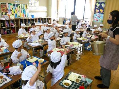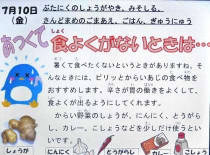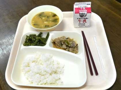 今日の献立は、豚肉の生姜焼き、みそ汁、サンド豆のごまあえ、ごはん、牛乳でした。1年生もおかわりをよくします。しっかり食べて元気な子に!