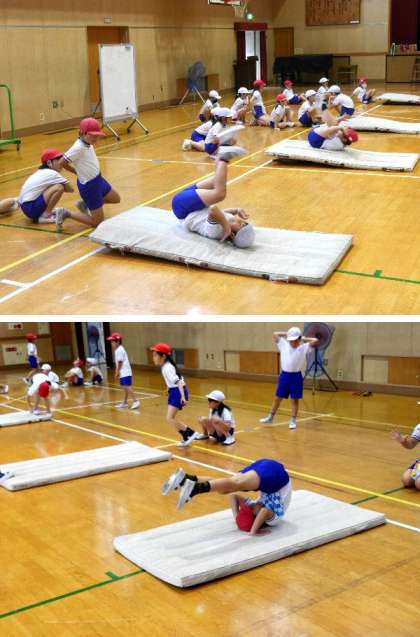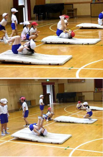 3年生ののマット運動では、後転の練習をしています。じょうずに立ち上がれるように、はずみをつけて回ります。少し坂を作って、まわりやすいマットで練習をしている子もいます。