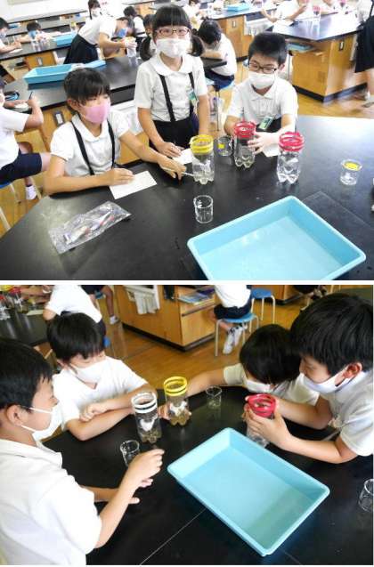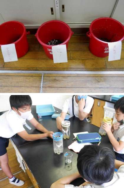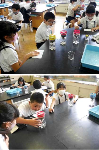 4年生が理科室で実験をしています。ペットボトルに、3種類の土を入れ、水のしみこみ方をしらべています。土は、運動場のつち、学習園の土、じゃりです。泥水がじゃりに入れるときれいになりますね。